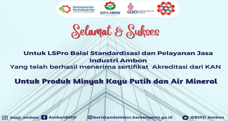 Selamat dan Sukses untuk LSPro BSPJI Ambon yang telah berhasil menerima sertifikat akreditasi dari KAN untuk kategori produk Minyak Kayu Putih dan Air Mineral.