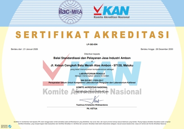 Melalui laboratorium uji yang terakreditasi oleh Komite Akreditasi Nasional sesuai dengan persyaratan standar ISO 17025:2017 dengan Nomor : LP-383-IDN, BSPJI Ambon mempunyai ruang lingkup meliputi : tepung sagu, roti kenari, bagea sagu, biji pala, fuli, minyak kayu putih, ikan asin, ikan asap, teripang kering, sirip cucut kering, cumi-cumi kering, ikan teri asin kering, air minum dalam kemasan, selai buah dan biskuit Laboratorium Uji BSPJI Ambon terdiri atas : Laboratorium Kimia Laboratorium Mikrobiologi dan Instrumen Laboratorium Lingkungan.