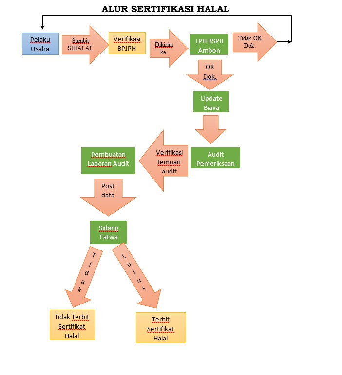 - BPJPH (Badan Penyelenggara Jaminan Produk Halal) memeriksa kelengkapan dokumen persyaratan dan produk/layanan yang diajukan pemilik usaha. Jika sesuai akan dikirim ke LPH BSPJI Ambon.